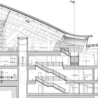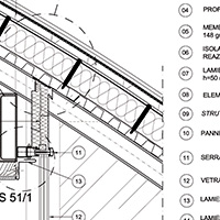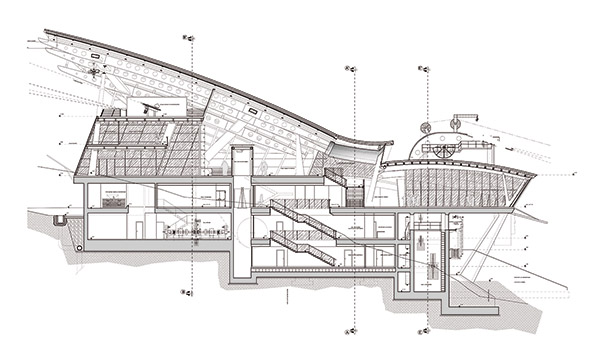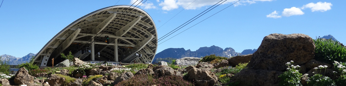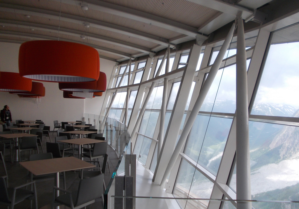Verso il Monte Bianco, una copertura ad ala racchiude le aree destinate all'accoglienza ed al ristoro del pubblico.