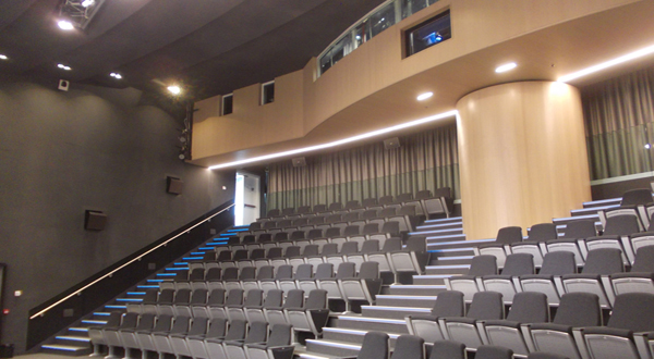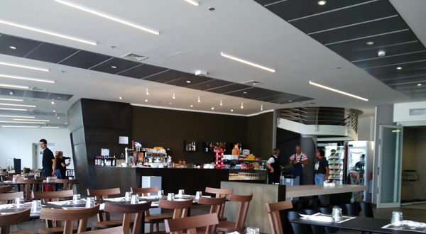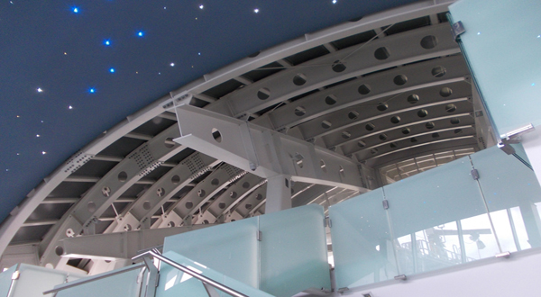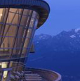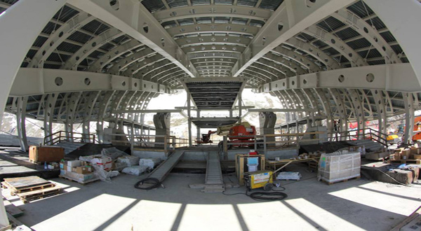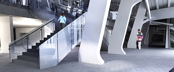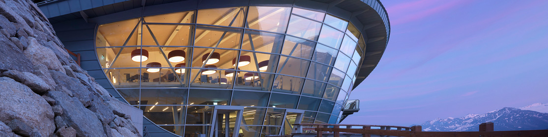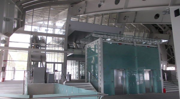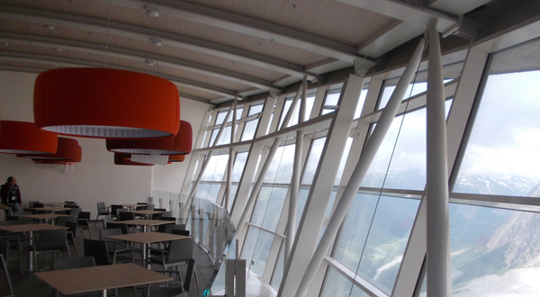 Interni della stazione. Sullo sfondo la grande cupola panoramica rivolta sul Monte Bianco, attrezzato per le informazioni al pubblico con sistemi multimediali.