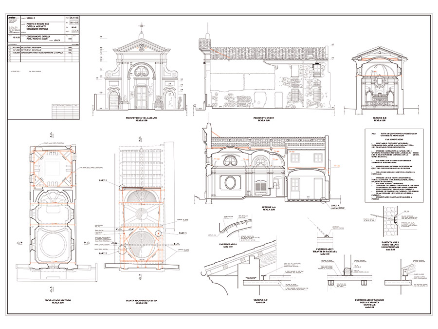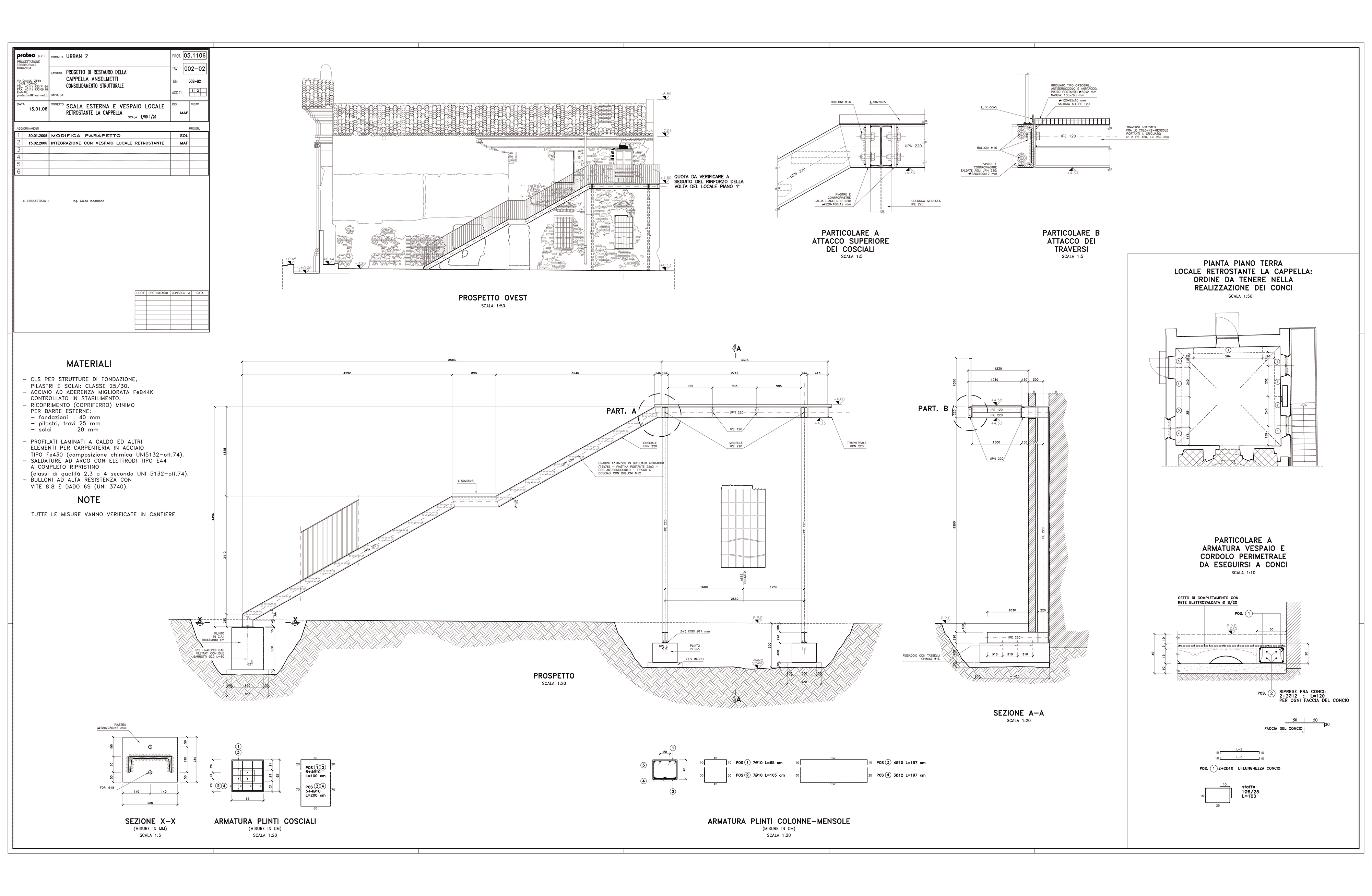 Oltre al progetto di una scala esterna in carpenteria metallica per il collegamento con il piano superiore del volume retrostante la cappella e il consolidamento fondale dello stesso volume, il progetto ha riguardato le strutture in acciaio di rinforzo strutturale per il miglioramento della resistenza del fabbricato in muratura mista (mattoni e pietre).