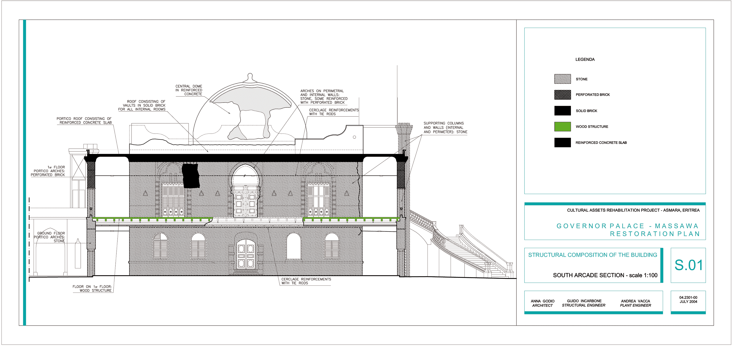 Il progetto di recupero strutturale, oltre a prevedere la ricostruzione dei volumi completamente demoliti, ha dovuto pertanto adattarsi alle diverse tipologie di strutture presenti (murature in pietra, solai in legno, solette e cupola in c.a., archi in mattoni e tiranti in acciaio), utilizzando tecniche il più possibile consoni alle capacità ed alle attrezzature disponibili fra le imprese locali, considerando che l'Eritrea è oggi uno dei paesi più poveri al mondo.