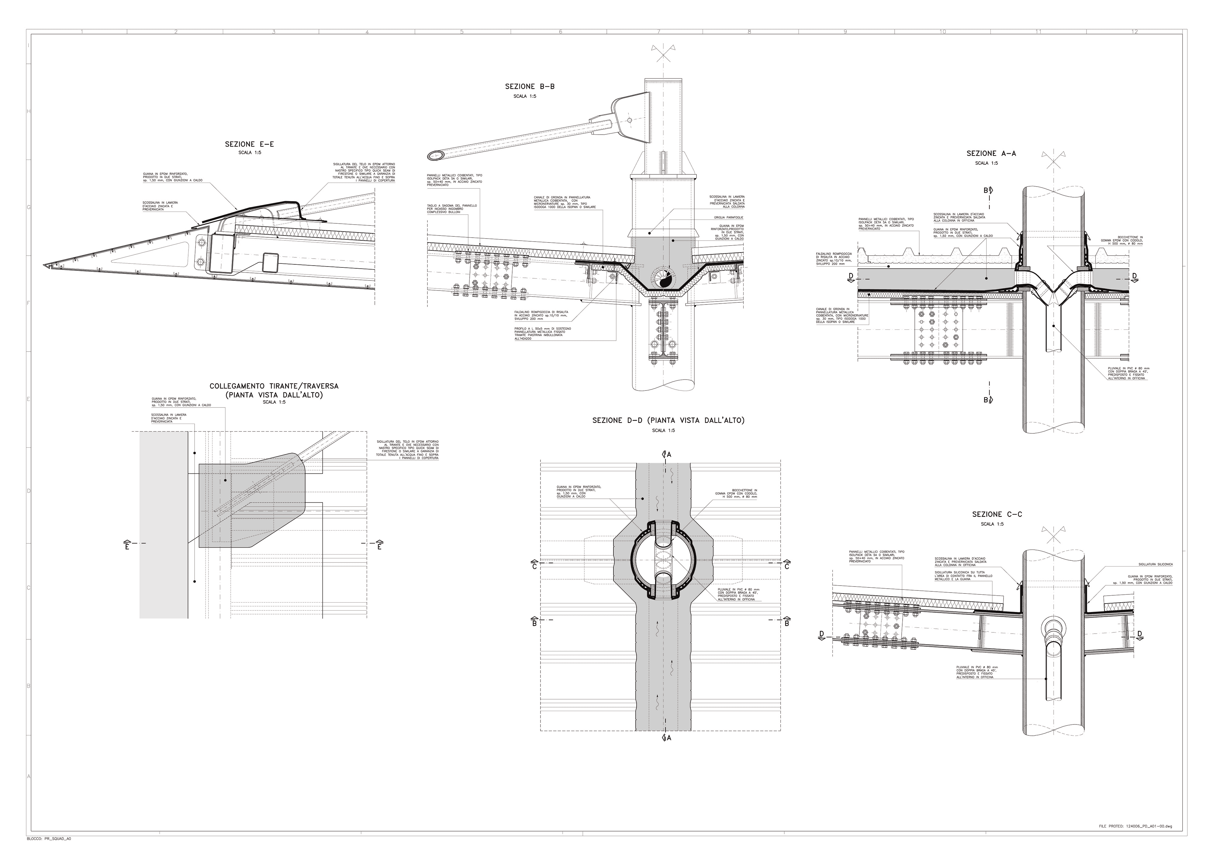 - Finitura all'estradosso realizzata con pannelli in doppia lamiera (grecata superiormente) con frapposto coibente, con funzione di antirombo, in acciaio zincato preverniciato. Canali di gronda centrale (impluvio) in pannelli metallici coibentati, impermeabilizzati superiormente con manto in EPDM rinforzato, con bocchettoni in gomma EPDM che si immettono nei pluviali in PVC predisposti all’interno delle colonne.