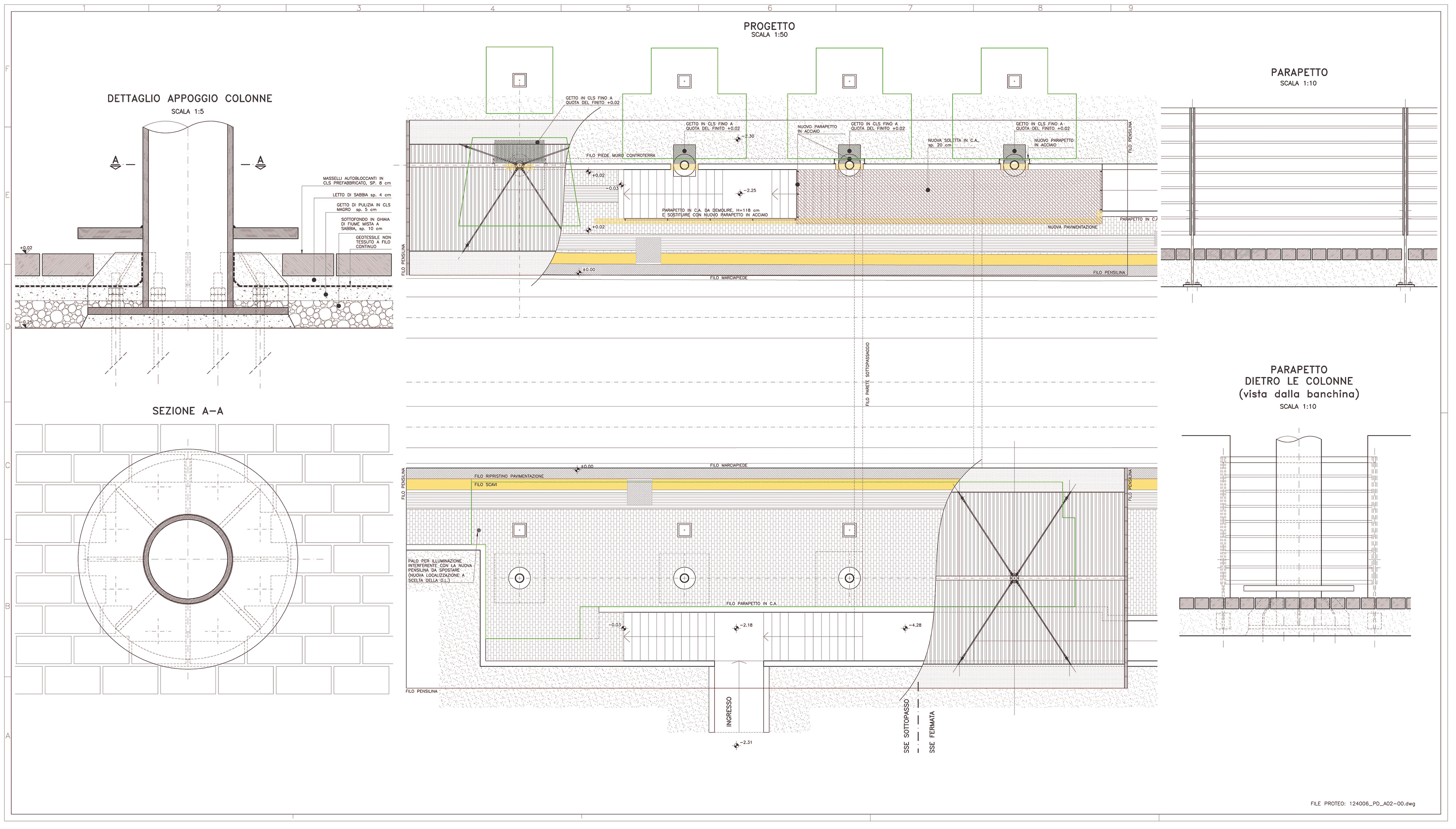 Il progetto prevede demolizione di parte delle banchine attuali, scavi e reinterri, per la realizzazione delle opere di fondazione in c.a. delle nuove pensiline, solette in c.a., carpenteria metallica strutturale, ripristino della pavimentazione delle banchine, copertura pensilina in pannelli metallici sandwich, faldalerie e sistema di raccolta acque meteoriche, con relativo allaccio alla fogna bianca, rivestimenti metallici all’intradosso, corpi illuminanti e relativo impiantio elettrico, assistenza alla posa di quest’ultimo.
