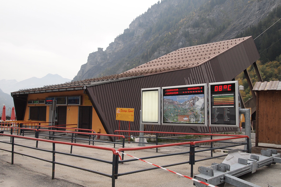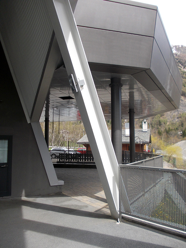 Nuovo elemento caratterizzante la stazione di valle è il portale di fronte alla biglietteria, realizzato con struttura in carpenteria metallica e finitura in lamiera zincata e preverniciata, come la nuova tettoia di copertura del cortile sul fianco Sud-Est dellíedificio, in continuità con il suddetto portale e realizzata con struttura e finiture dello stesso tipo di quelle del portale.