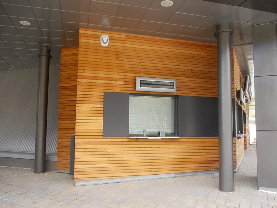 La zona ingresso/biglietteria di valle e le facciate di monte vengono rivestite a tutta altezza da una pannellatura dogata in legno Iroko con i serramenti esterni a fascia continua, in alluminio anodizzato e vetrocamera.