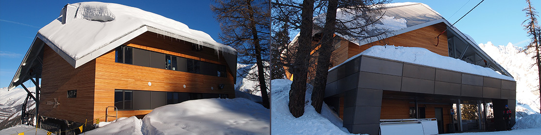 Il progetto prevede alcuni interventi di ristrutturazione esterna tra cui l'adeguamento alle normative di sicurezza per l'impianto funiviario, che prevede la rimozione dei rivestimenti in legno intorno all'impianto, quindi sia dalla facciata che dalla copertura, e la sostituzione con pannelli in doppia lamiera grecata con frapposto coibente, dotati di fermaneve in acciaio.