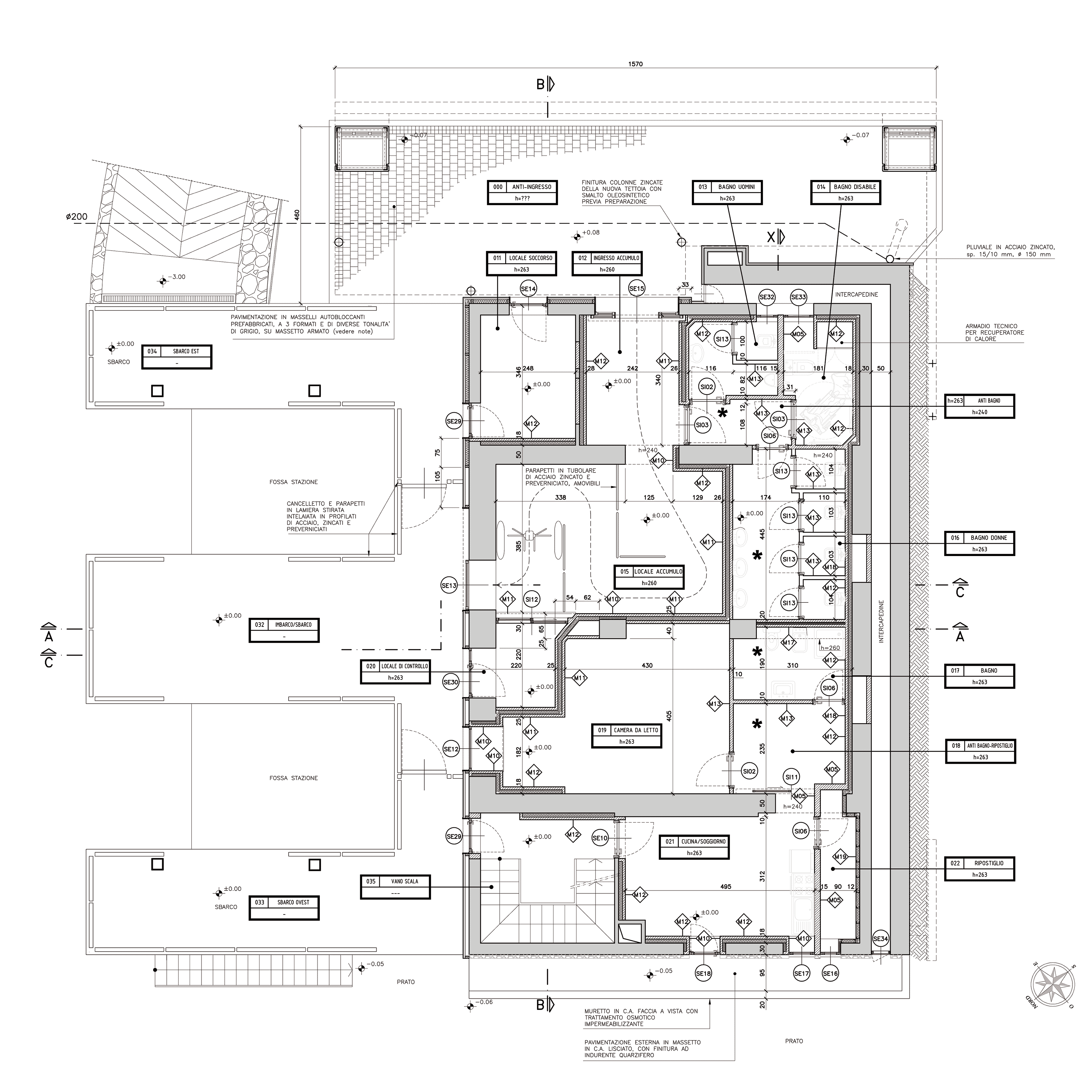 A valle della stazione, alla quota del piano inferiore si realizza un accesso carraio con due muri a scogliera a gravità ed un piano stradale in calcestruzzo armato con finitura a lisca di pesce, con griglia di raccolta acque terminale.